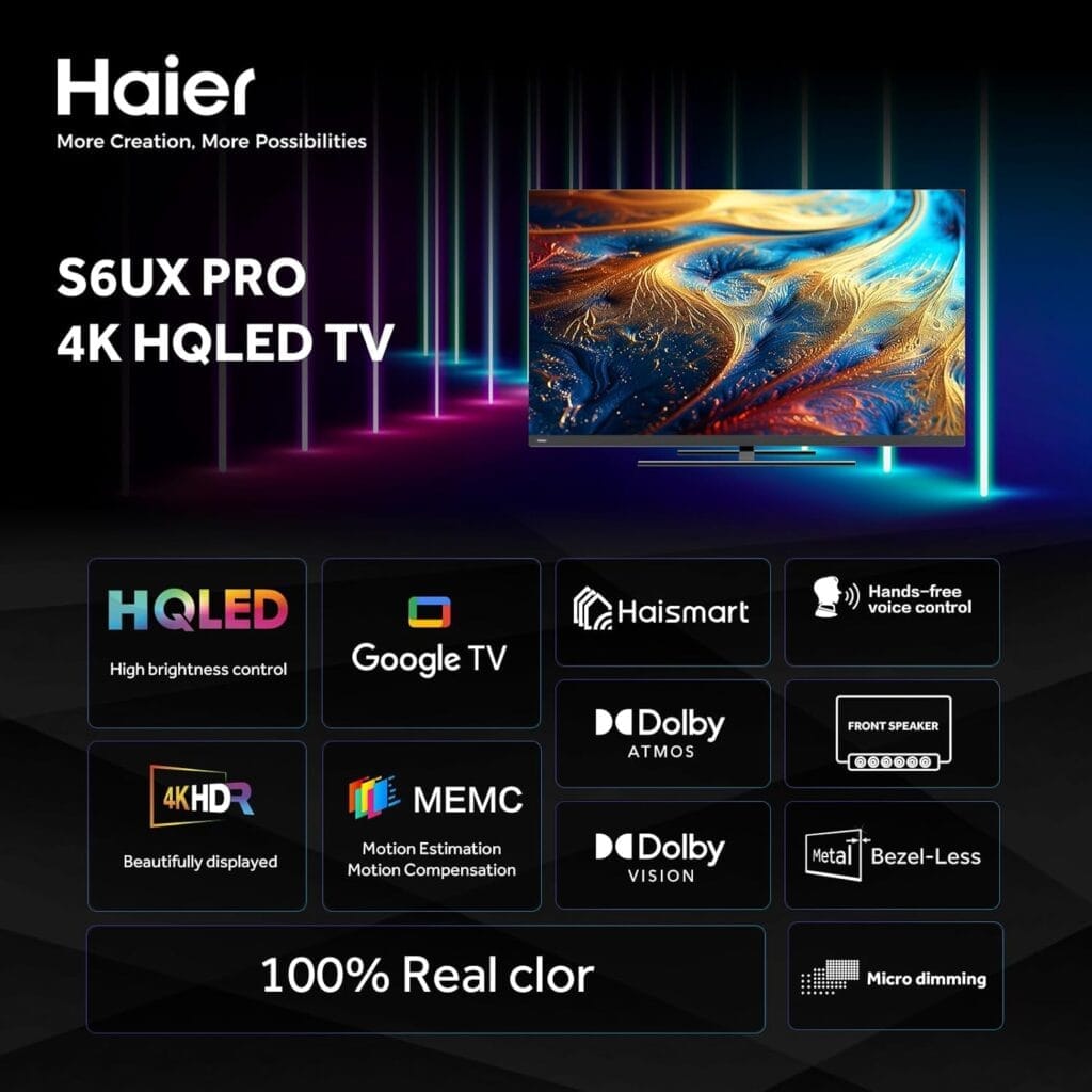 تلفزيون 65 بوصة هاير QLED الذكي – دقة 4K UHD، تردد 120 هرتز، Dolby Vision وHDR10، Google TV، HDMI 2.1، بلوتوث 5.1، تصميم أنيق بدون حواف – موديل H65S800UX